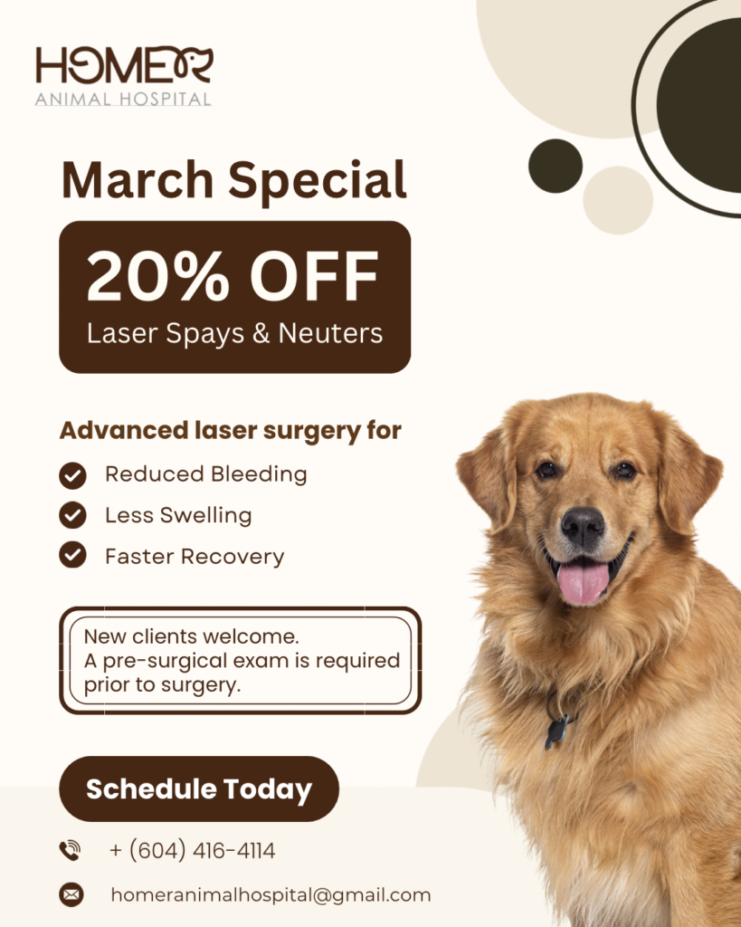 You can book an appointment by calling us at [+16044164114] visiting our website [Homer Animal Hospital], or stopping by in person during clinic hours.You can also Download our Pet desk App by clicking the link at the end of home page.